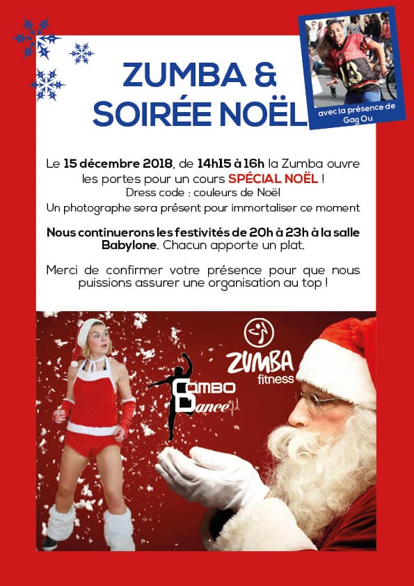Salle Babylone 1 15 avenue du Belvédère, Le Pré St Gervais, FranceCours Spécial Noël le 15 décembre de 14h15 à 16h Dress code : Couleurs de Noël ! Suivi par une soirée conviviale dans la salle Babylone2, chacun apporte un plat.
